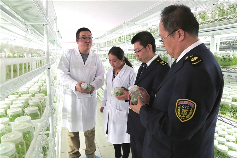 質(zhì)監(jiān)工作人員來(lái)到烏蘭察布市民豐種業(yè)公司,了解標(biāo)準(zhǔn)化育苗情況。